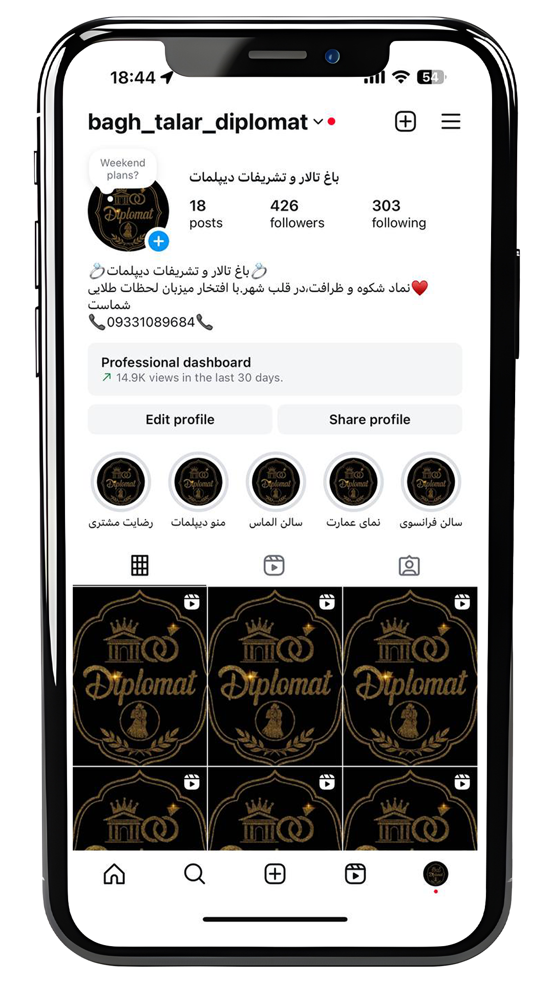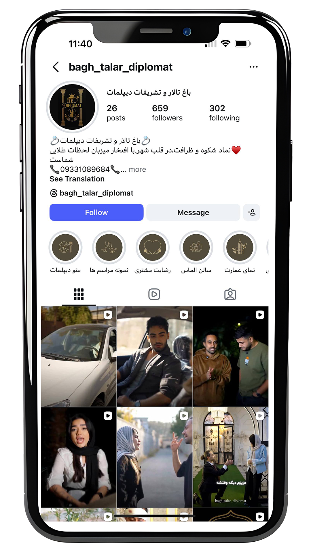 باغ تالار دیپلمات بهعنوان یکی از مجموعههای معتبر در برگزاری مراسم و جشنها، از طریق اینستاگرام خدمات و فضاهای خود را به مخاطبان معرفی میکند. اسپانتا وب با مدیریت و پشتیبانی کامل پیج اینستاگرام باغ تالار دیپلمات برنامهریزی محتوا، سناریونویسی، فیلمبرداری، تولید و تدوین ویدیو، طراحی پست و استوری و ادمینی پیج به بهبود هویت بصری، ارتقای کیفیت محتوای صفحه و افزایش تعامل دنبالکنندگان با این مجموعه کمک مؤثری داشته است.